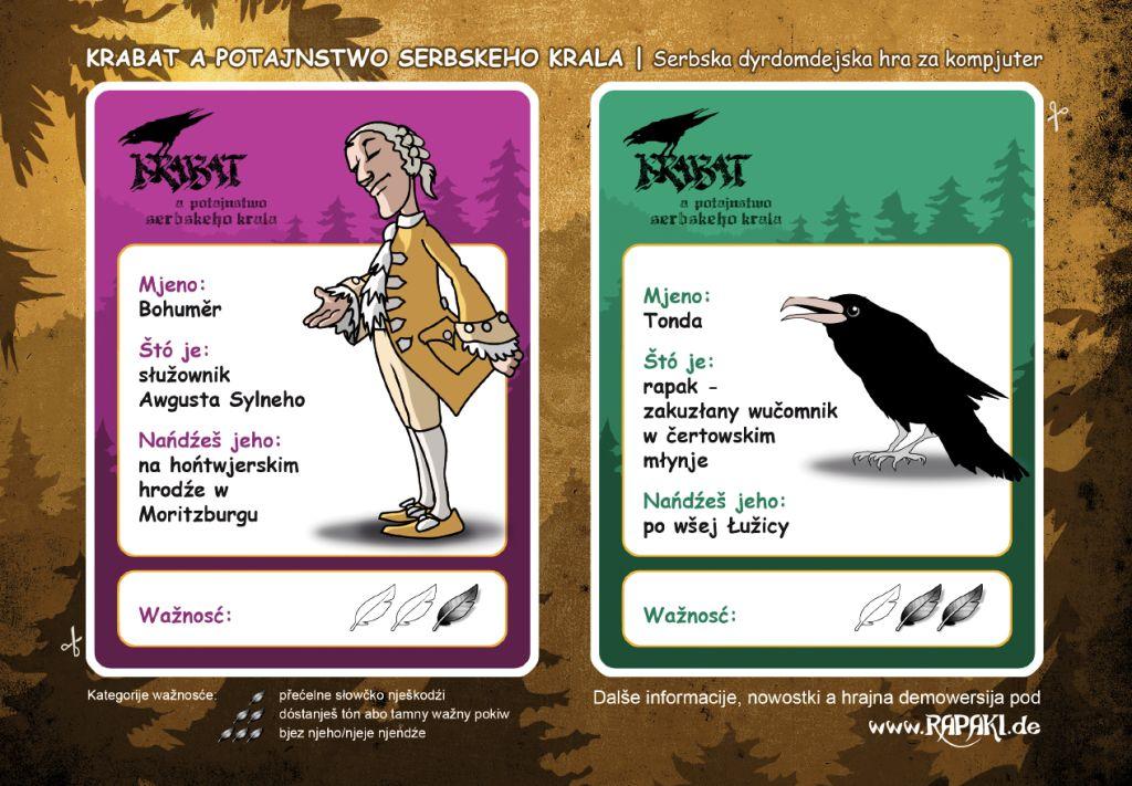 Čitarki a čitarjo serbskeho časopisa “Płomjo” wjeselichu so 2014/2015 na něšto wosebiteho: na zadnjej wobalkowej stronje Płomjenja namakachu so zběranske karty z wšelakorymi figurami hry k wutřihanju. Woni pokazaja, na kotrych městnach w stawiznje so figury namakaja a kak wažne za spjelnjenje wulkeho dyrdomdejstwa Krabata su. Tule hišće jónu wšitke kartki zhromadneje akcije Płomja a RAPAKOW: